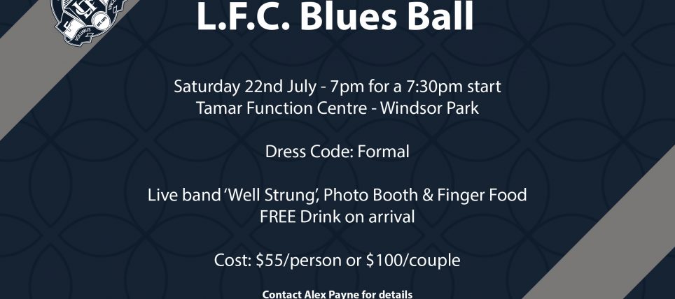 Launceston Football Club Presents… LFC Blues Ball – Saturday 22nd July 7pm Tamar Function Centre, Windsor Park Live Band ‘Well Strung’ Photo Booth Finger food Free drink on arrival Dress Formal $55/person or $100/couple